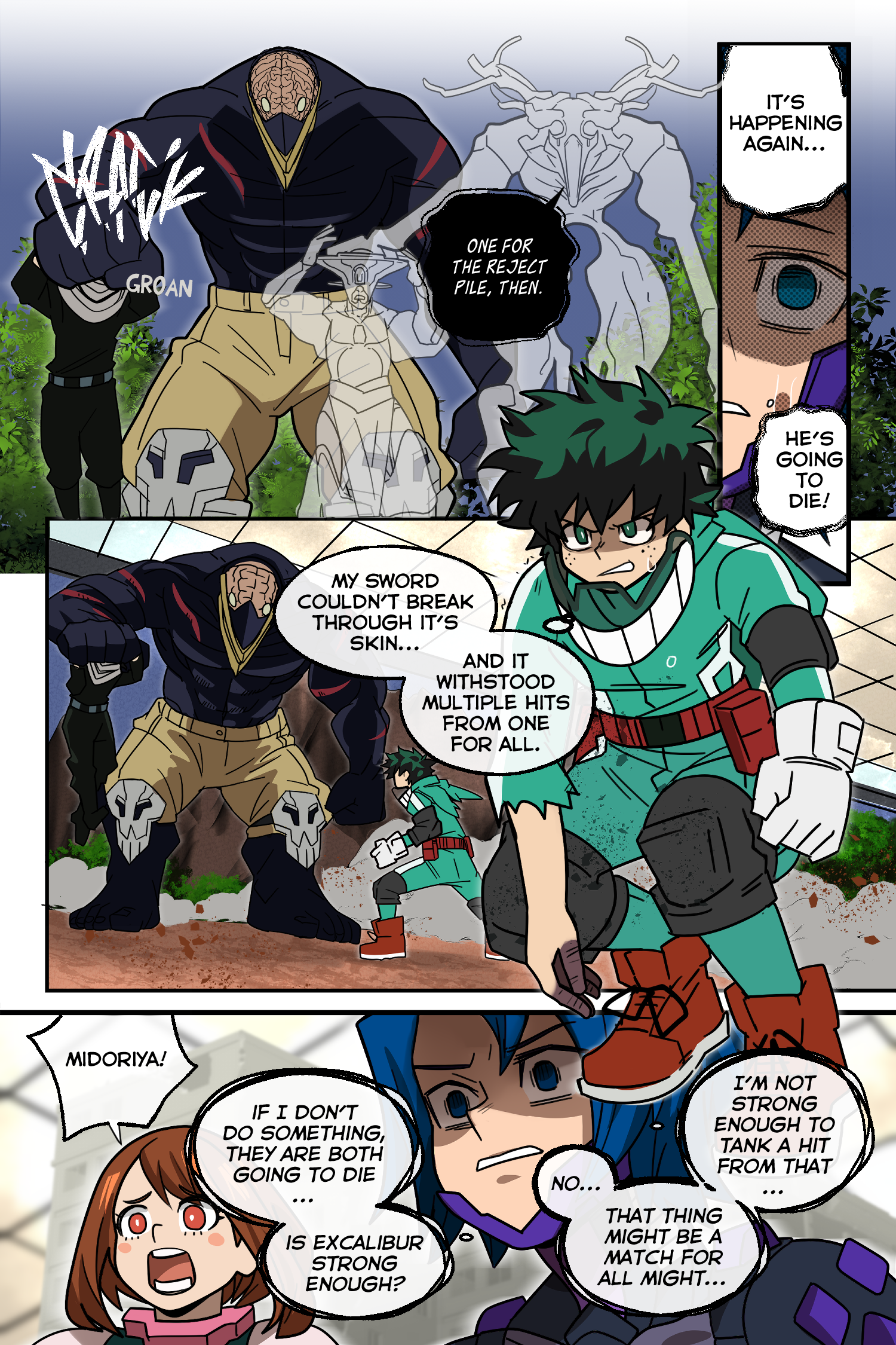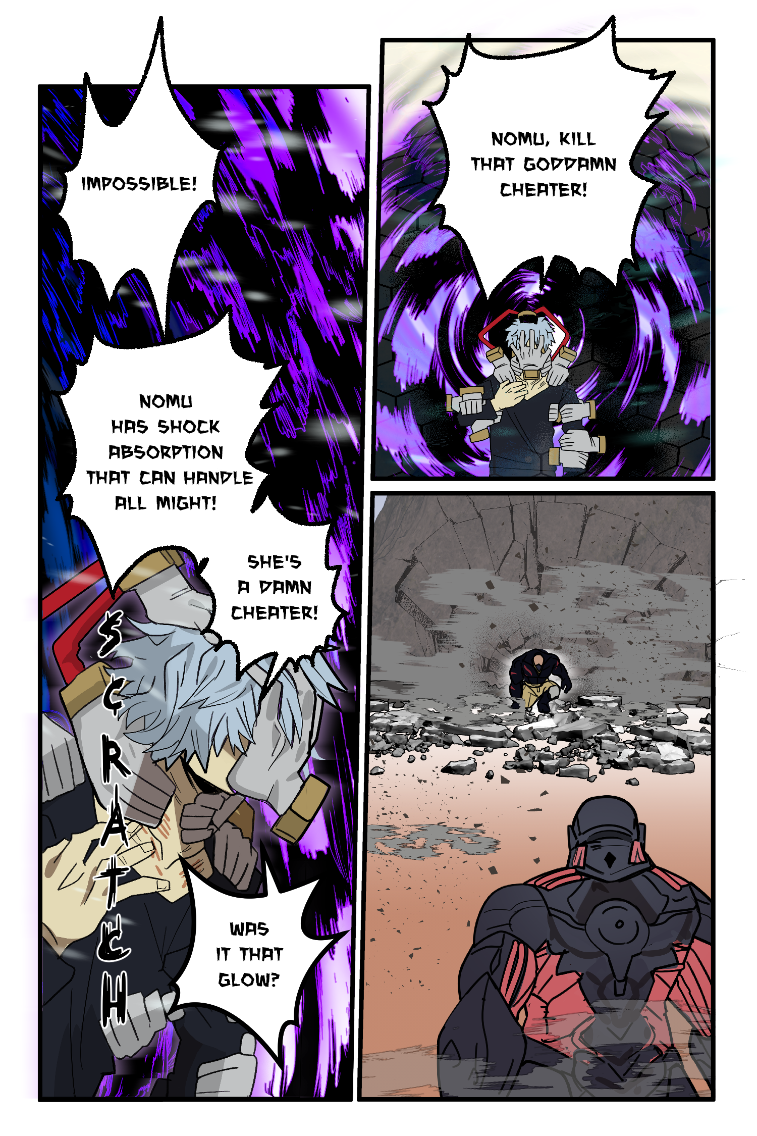 “Hey, answer me, dammit!” Hitoshi raised his fists as panic and uncertainty overcame him. ‘He’s so fast! I can’t-’ Within seconds, Izuku was before him. Hitoshi threw an uncoordinated but otherwise adequate punch, missing as Izuku ducked and hooked his arm around Hitoshi’s outstretched one.