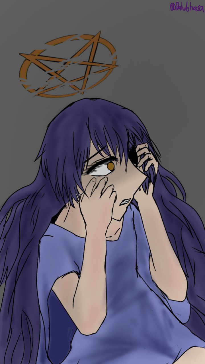 A short girl with violet hair without eyes and without legs dragged herself through the forest with her feeble arms as she bled.