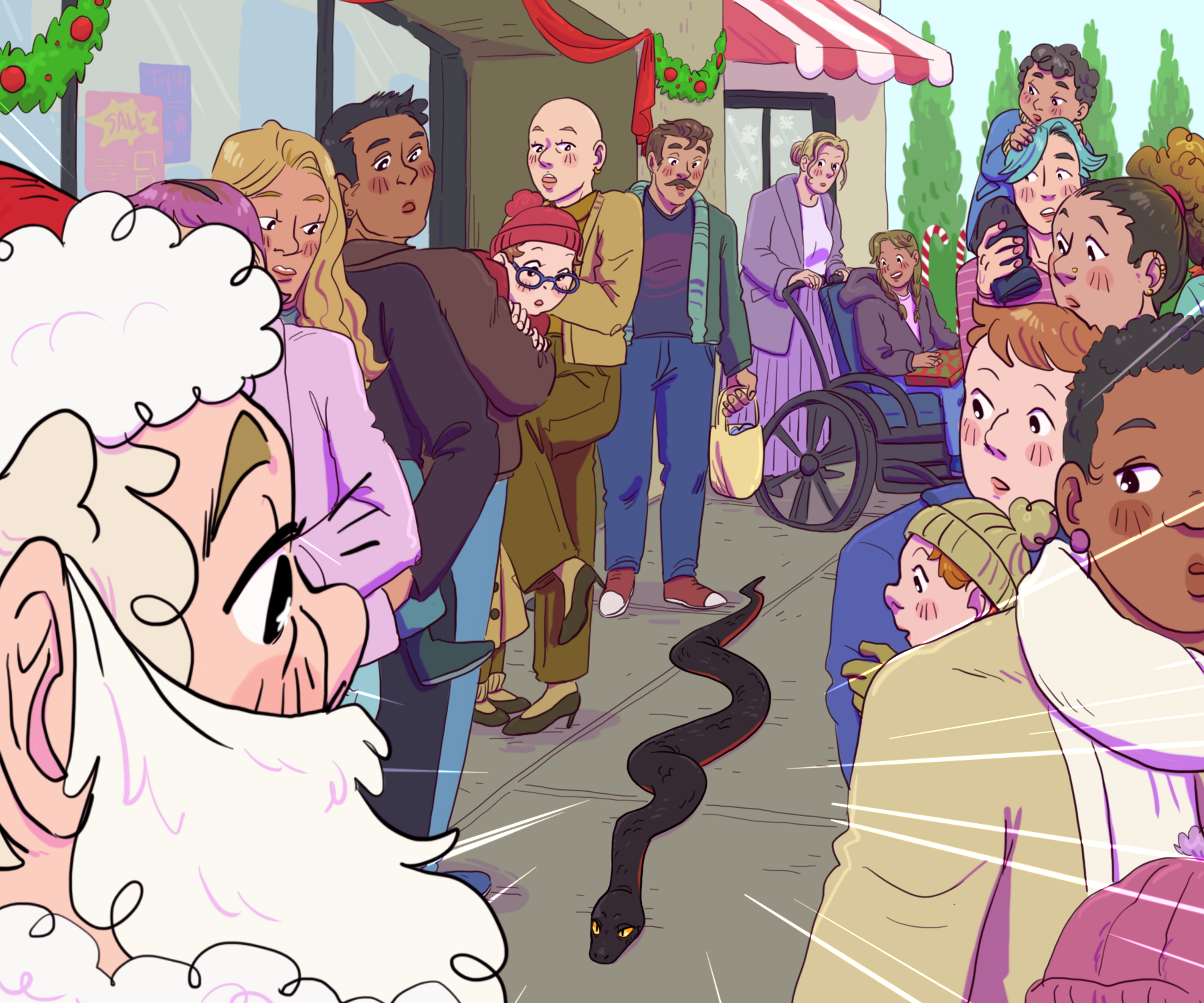“Don’t be afraid, ladies and gentlemen!” he calls uselessly, although most of the parents have already absconded with their children. “Just give Santa a few minutes to sort this snake out, and all will be well!” He reaches behind the doorframe of the workshop and pulls out a sign (from seemingly nowhere) that reads “BACK IN 5 MINUTES!” He hurriedly, and surreptitiously, ushers the snake into the workshop, hangs the sign on the doorknob by a hemp-wrought rope, and snaps the doors shut behind him.
