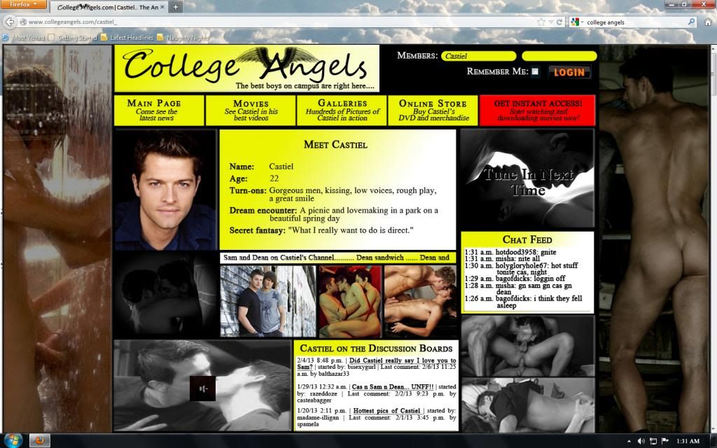 The chat room lights up with immediate responses -- hi dean and happy v-day, too bad you can’t take my v-card lolol - and mostly whats the big announcement? Lots of that last one. They’ve been expecting it. Monitoring the forums over the past week, they’ve seen a lot of speculation about what Castiel and his playmates are planning on springing on them. Guesses range from a we-quit-doing-porn announcement to the addition of a fourth to their threesome. Neither are true.