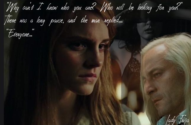 His hand crossed in front of her face and rested gently against her cheek the barest of moments before he suddenly released her and when she turned, she saw only a tall cloaked figure walking briskly down the side street before disapparating into nothing…