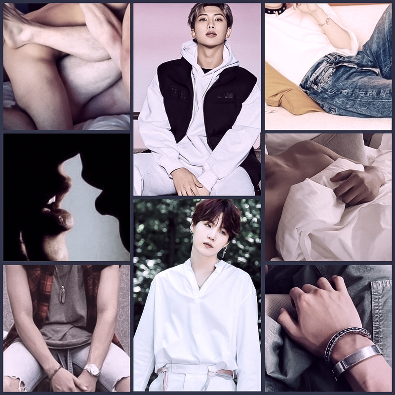 Namjoon groans, his thrusts get faster and harder as Yoongi gets closer to his release. He slides his hand between their connected bodies and wrap his fingers around Yoongi's cock. And then—he plays with him.