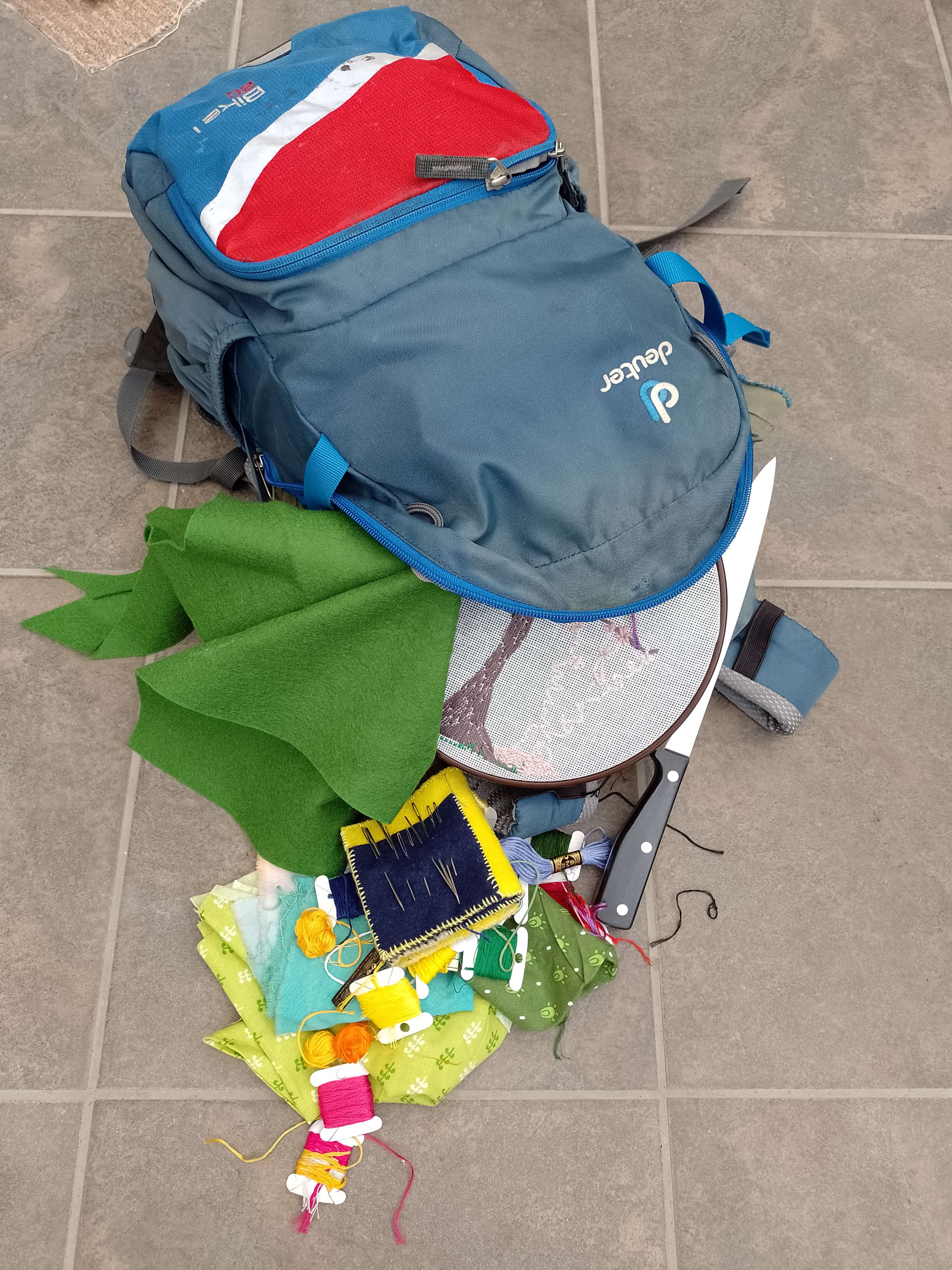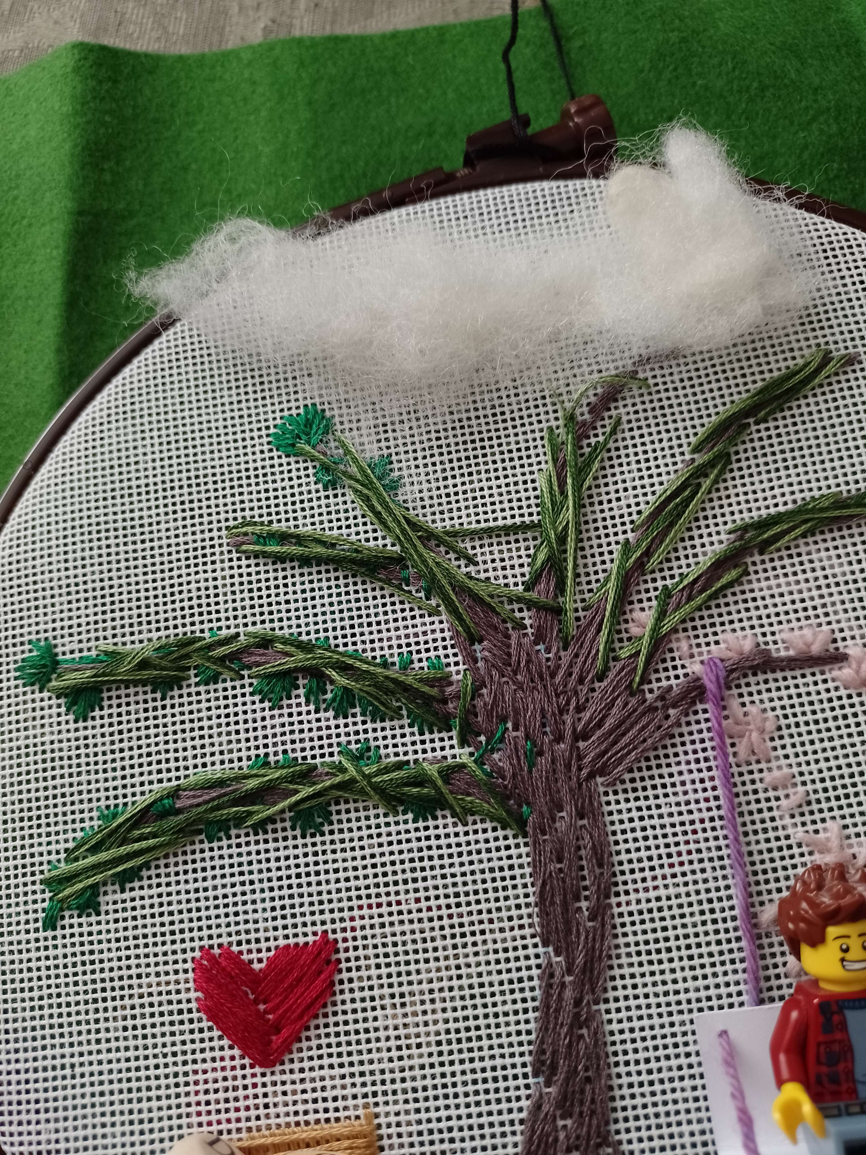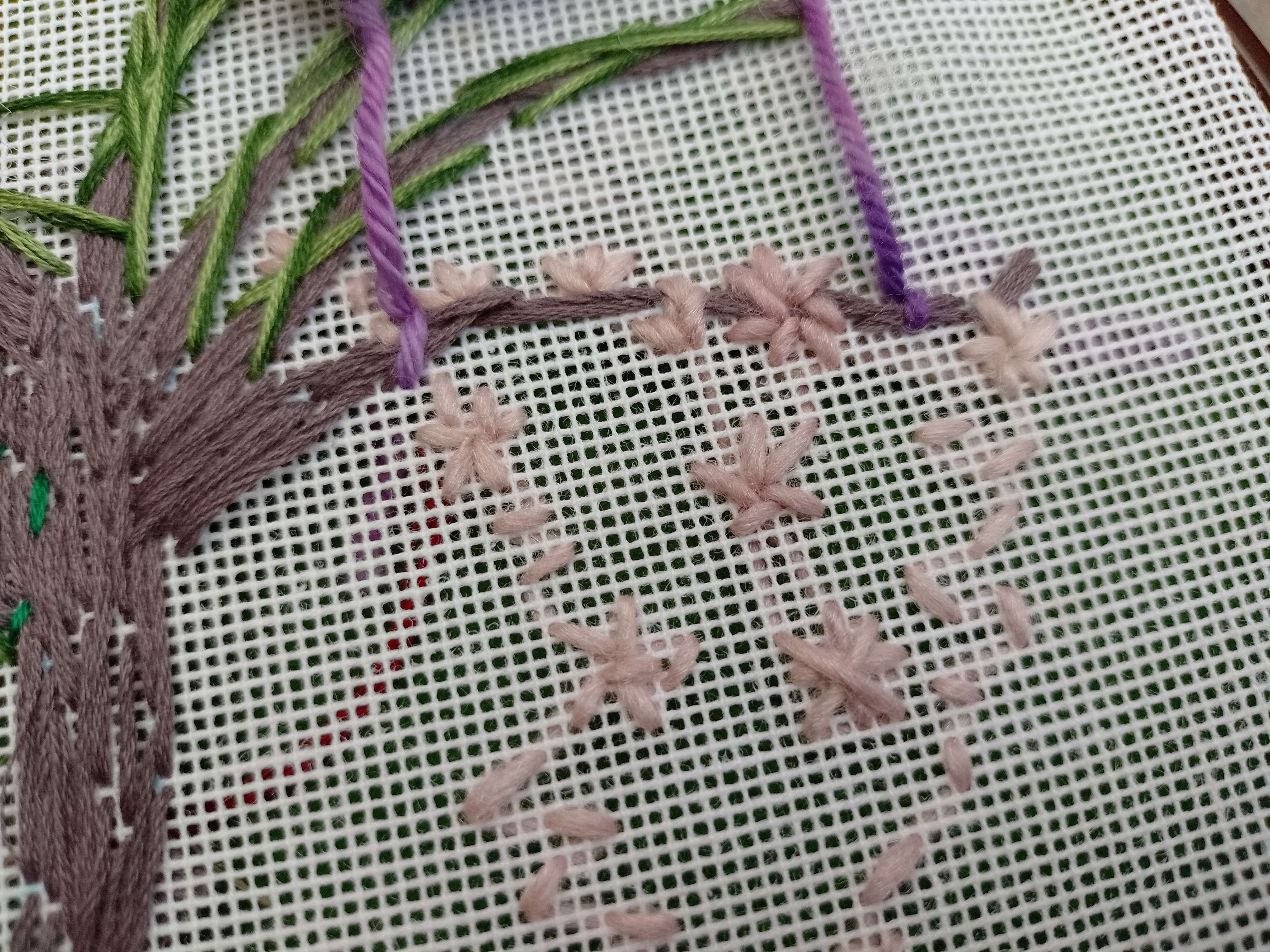 I had started doing short stitches for the trees but I didn't think they'd provide enough coverage or blend with the tree well enough, so I covered with the long stitches.
