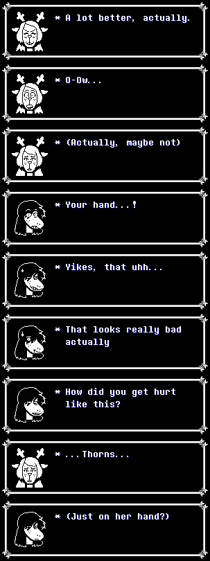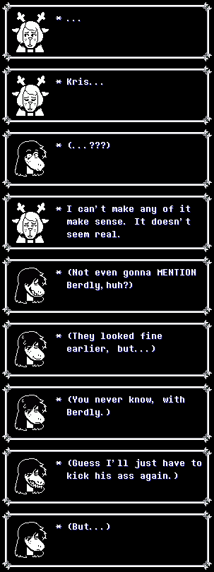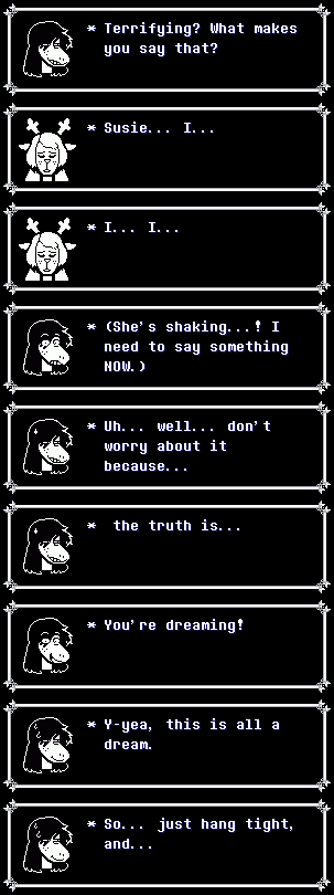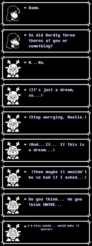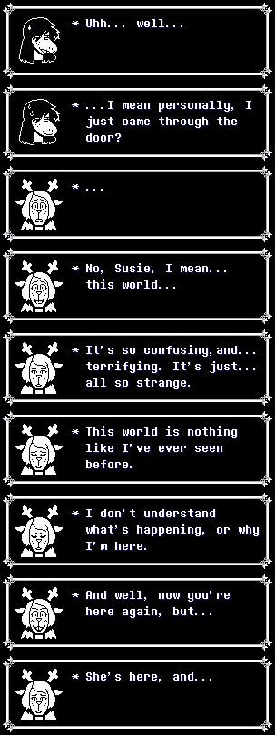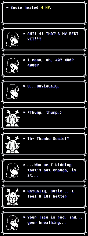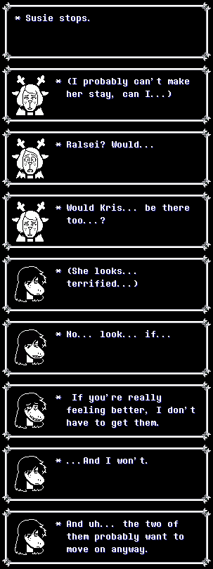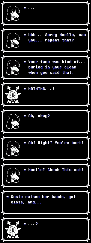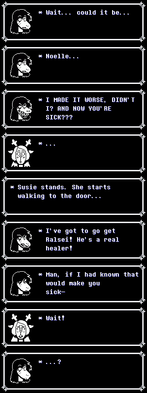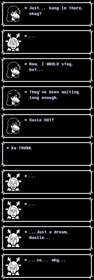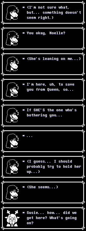 Susie leaves her party alone in order to rescue Noelle from the Queen’s clutches. She enters Noelle’s room, and finds her exhausted. Although confused, Susie tries to comfort her.