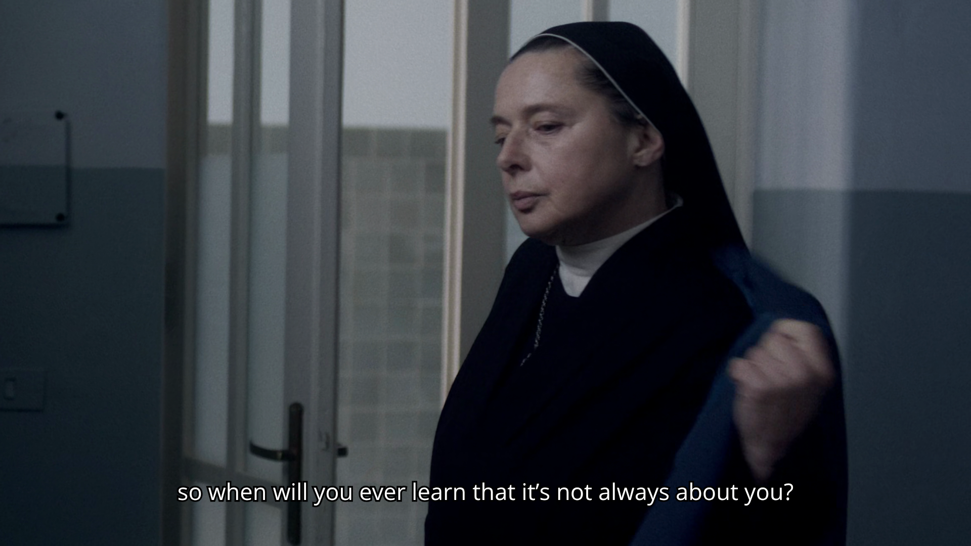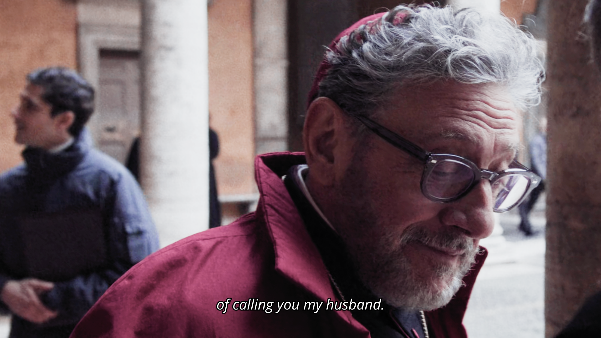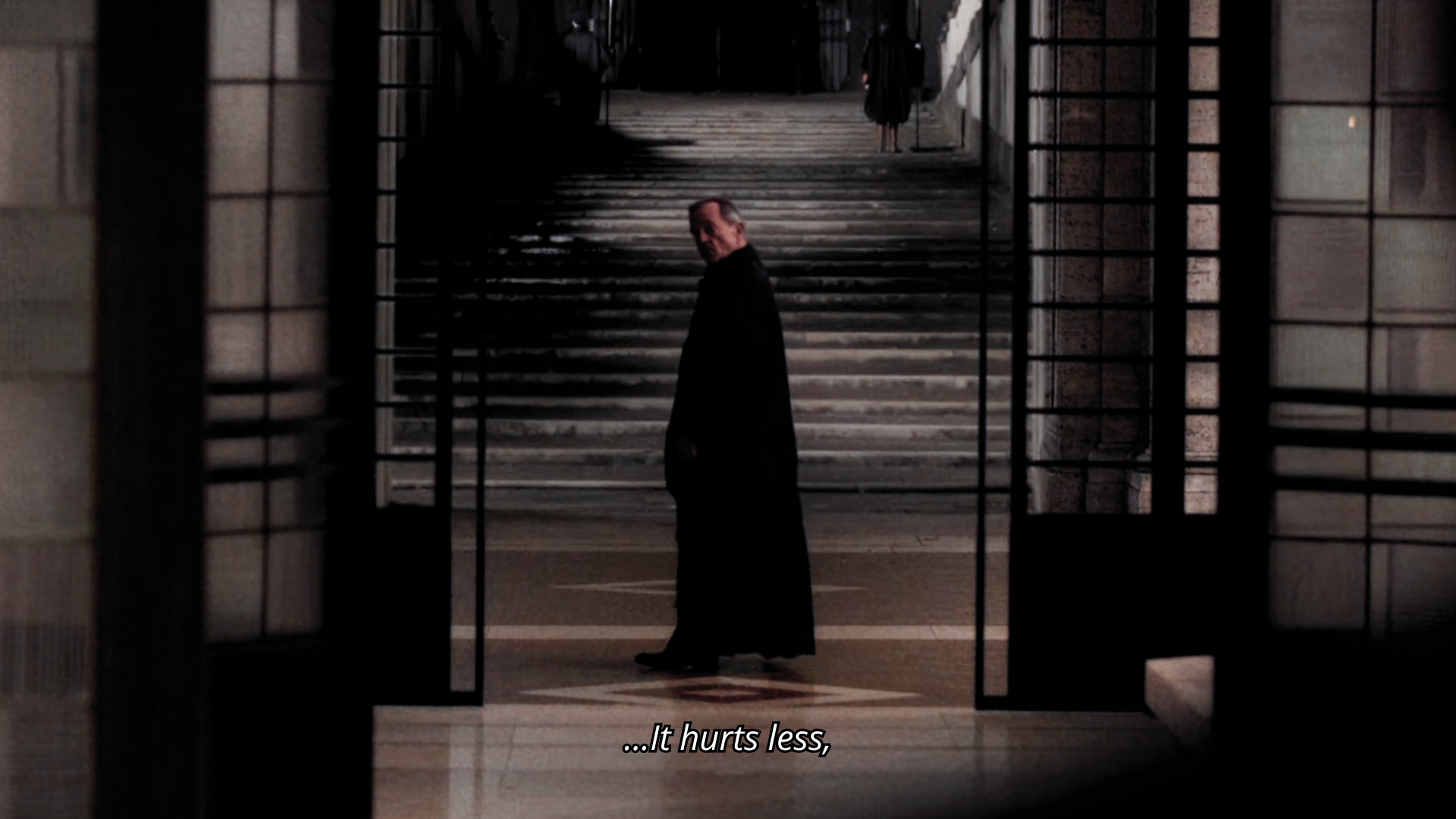 "Inginocchiati, Padre. Apri bene." = "Kneel, Father. Open wide."