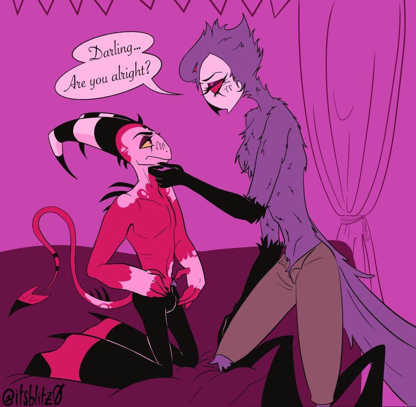 “Need to get bandages,” Blitzø forces out. He leaps off the bed before Stolas can say anything, grabbing the first aid kit they’d added to the toy chest. Stolas heals fast, but Blitzø always cleans the wounds and dresses them properly anyway. Always.
