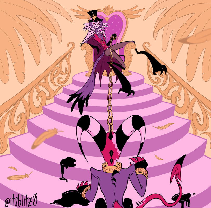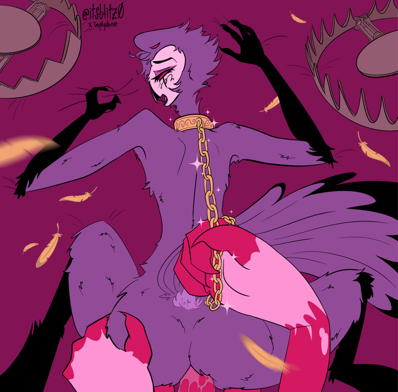 He looks down at the blue-gray plumes but his mind must be broken, because all he sees is a gold chain. In his hand, connected to a collar gleaming around Stolas’ neck. He pulls it and Stolas screeches again, his hips rocking back to take Blitzø deeper, harder.