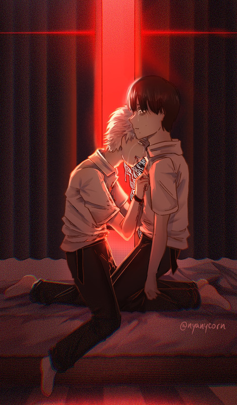 Through his bangs, Yoshiki steals a glance just as he– it coughs. Blood spills on the bedsheets, slightly glistening in the eerie red glow of the sunlight. The being that stares at him from the bed looks like a wounded animal, his eyes filled with small, unshed tears. His left side of the face melts, the indiscernible matter moving in slow but panicked motions as the sunlight slightly cuts through it. It looks alien – wrong – so Yoshiki can't help but look away.