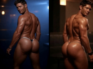 He wore nothing but a tiny thong that did nothing to contain the magnificent, round swell of his ass—an ass Sam had secretly coveted for years, even through the haze of hatred, sneaking glances in the shower or when Dean bent over the Impala. It was plump, perfectly shaped, like two firm globes begging to be grabbed, and Dean knew how to work it. His movements were a study in seduction, a raw, powerful display of masculinity commodified for the gazing crowd. He gripped the pole, sliding down it slowly, then dropped into a deep squat, his back to the crowd, showcasing the incredible, voluptuous curves of his rear. The thong rode up between his cheeks, exposing smooth, tanned skin that jiggled slightly with each thrust of his hips. Men whistled and cheered, tucking bills into his waistband—fives, tens, twenties fluttering like confetti. Dean's face, when it was visible as he turned, was a mask of detached professionalism, his green eyes distant, but his body… his body was telling a different story. It was a masterpiece of muscle and sinew, his cock straining against the thin fabric, half-hard from the attention or the adrenaline, built for this, moving with an innate, shameful talent that made Sam's own dick twitch in his jeans despite himself.