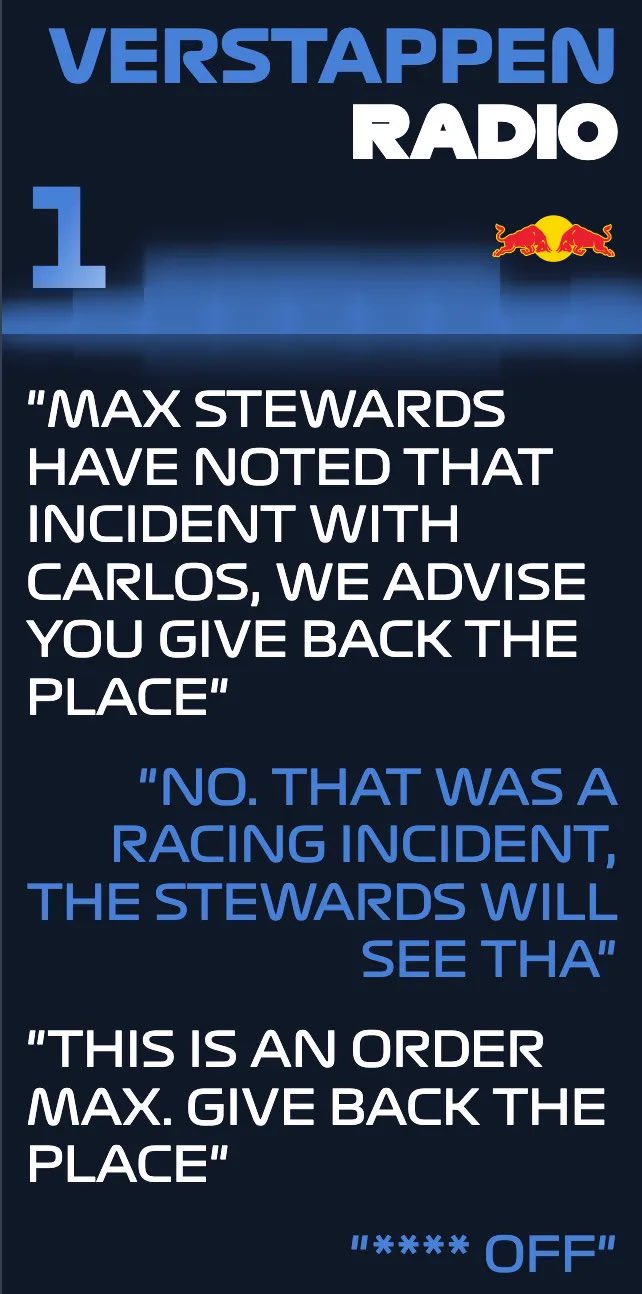“Maybe it would be helpful for me to say what I have been told and have you fill in the gaps. I am under the impression you have been unhappy with the team’s decisions, the car is struggling, and the press paints it as you dropping from your prime. In an attempt to fix it, you are leaving it all on the track regardless of risk or consequence and now you’re at risk of a race ban and potentially having your seat revoked… is that right?”