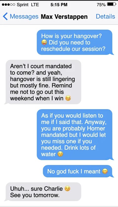“Sit down Max” Christian replies, staying seated. His voice attempting to be calm, but Max can tell he is pissed. Max slams the door behind him, knowing Christian to be just as stubborn as him. His knuckles whiten from holding his own grip, as he walks over to the mirror to take off his hat and fix his hair. Max’s cheeks are a patchy, flushed red and his lips slightly bruised. He didn’t realise how forcefully he was biting his lip to stop from blowing up. He lightly brushes his hair with his hands and turns around to meet Christian’s gaze again, his back leaning against the table behind him. The silence fills the room, but Christian gives in and breaks first, “Today was unacceptable”.
