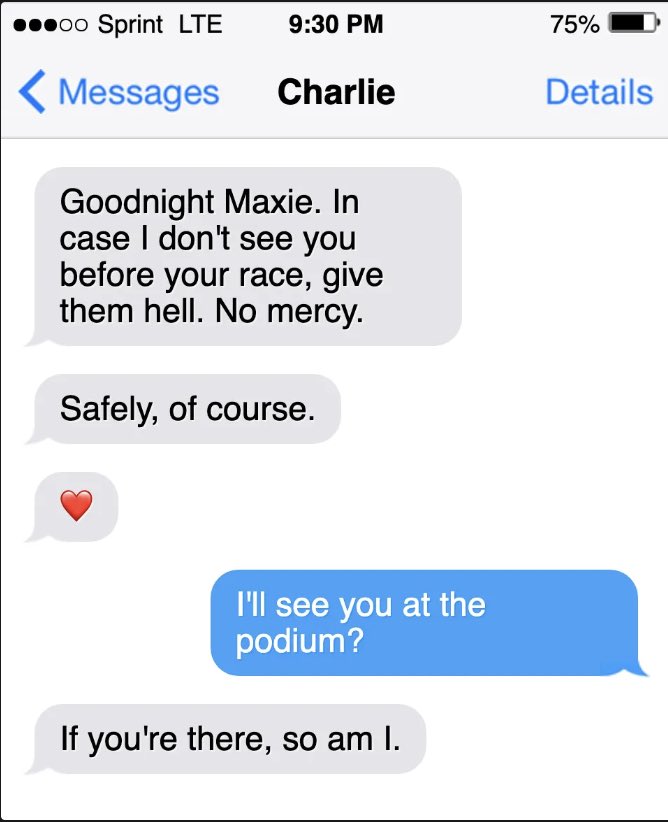 He rocks back and forth, clamping his eyes shut against the fabric of the pillow. Max throws the pillow across the room, matching the fate of the last pillow. He strikes the top of his head with two closed fists. Once. Twice. Three times.. until he runs out of energy. He knows how much pain he will be in tomorrow, but it works. His breathing slows but his body feels heavy and lifeless. He musters up enough energy to reach for a water bottle on the table and waits until he is able to walk out for the race debrief.