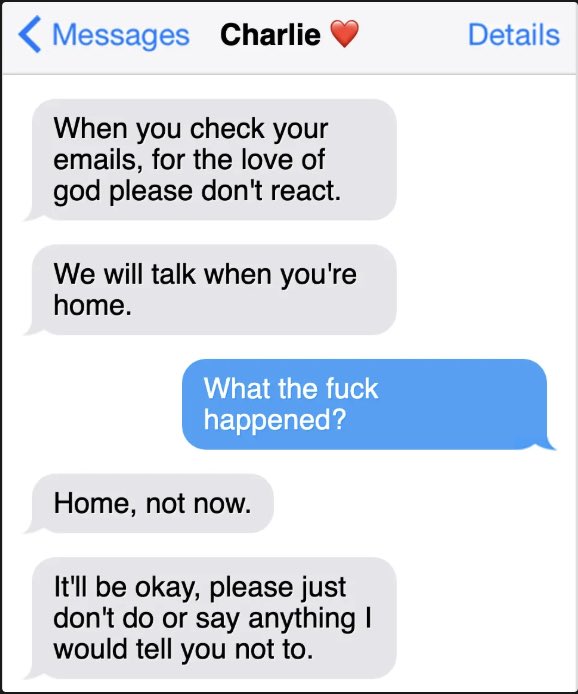 “No, you don’t” Her voice shakes “You have no idea, Charles. For now, do not tell Max about this. He is still pissed you’re fired and will do something in impulsive defiance. I will tell him after Abu Dhabi”
