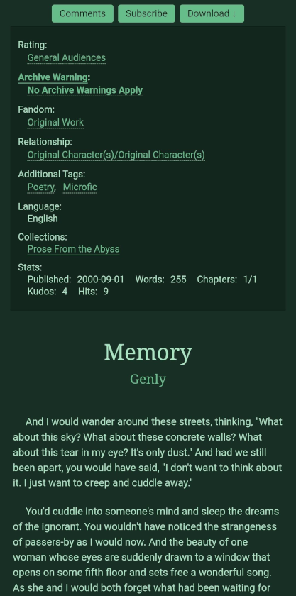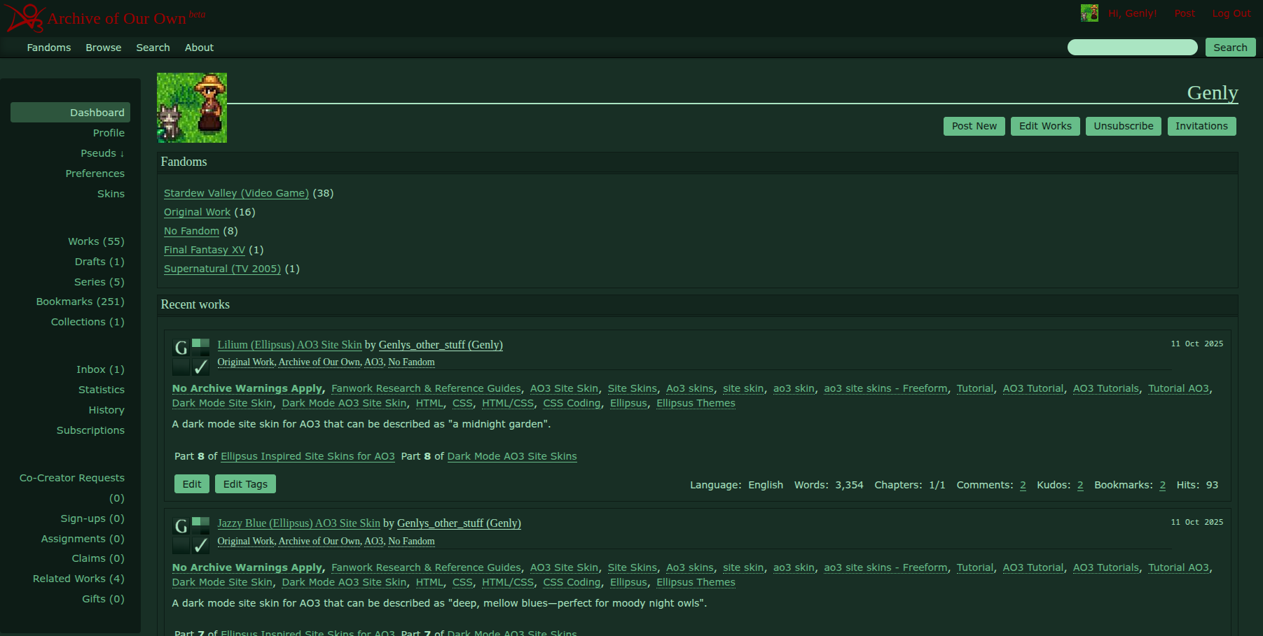 Which is why I've built a whole series of site skins, to adapt those same colour themes for use on AO3. You can follow the instructions below and copy the code to make your version of AO3 look almost exactly like your favourite Ellipsus theme. Enjoy!