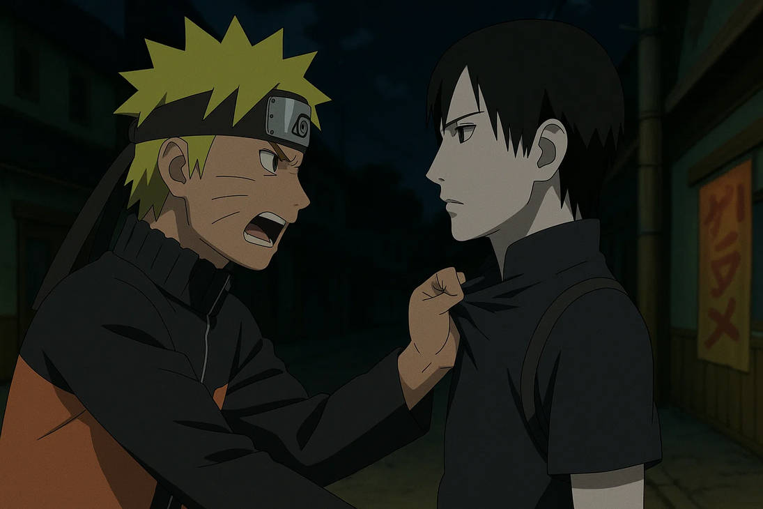 Naruto seized him by the collar, the fabric bunching in his fist. His eyes burned, bright and raw. “Watch it, Sai.”