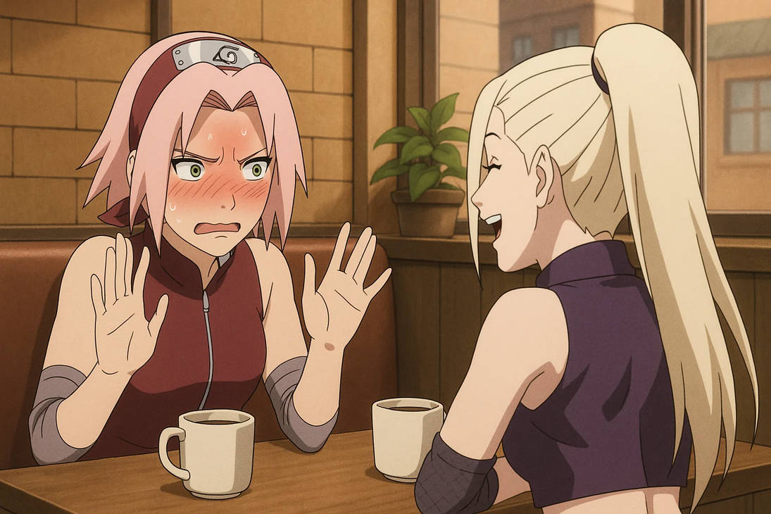 Sakura’s head shot up, eyes blazing. “INOOOOO!” Her fists slammed the table, rattling the cups and drawing stares from nearby patrons. “You are such a child! What are you, twelve?! Say that one more time, Ino, and I swear you’ll be watering your flowers with your own tears.”