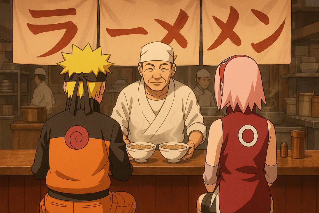 The steam rising from Ichiraku’s pots thickened the air like early morning fog, carrying with it the tang of broth and grilled pork. Lanterns swayed against the dusk breeze, their light trembling over the worn counter where two familiar faces sat side by side. Naruto leaned forward, chopsticks poised in both hands, eyes fixed on his bowl with the reverence of a man about to meet destiny.