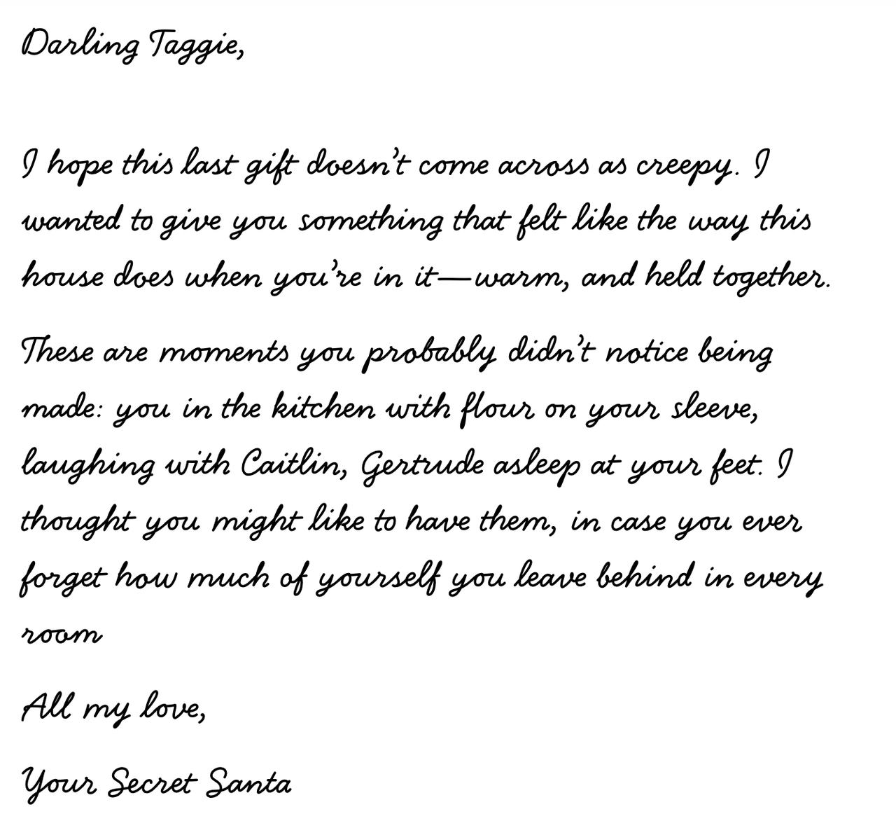 “I wish you’d been my Secret Santa,” he adds in the quiet.