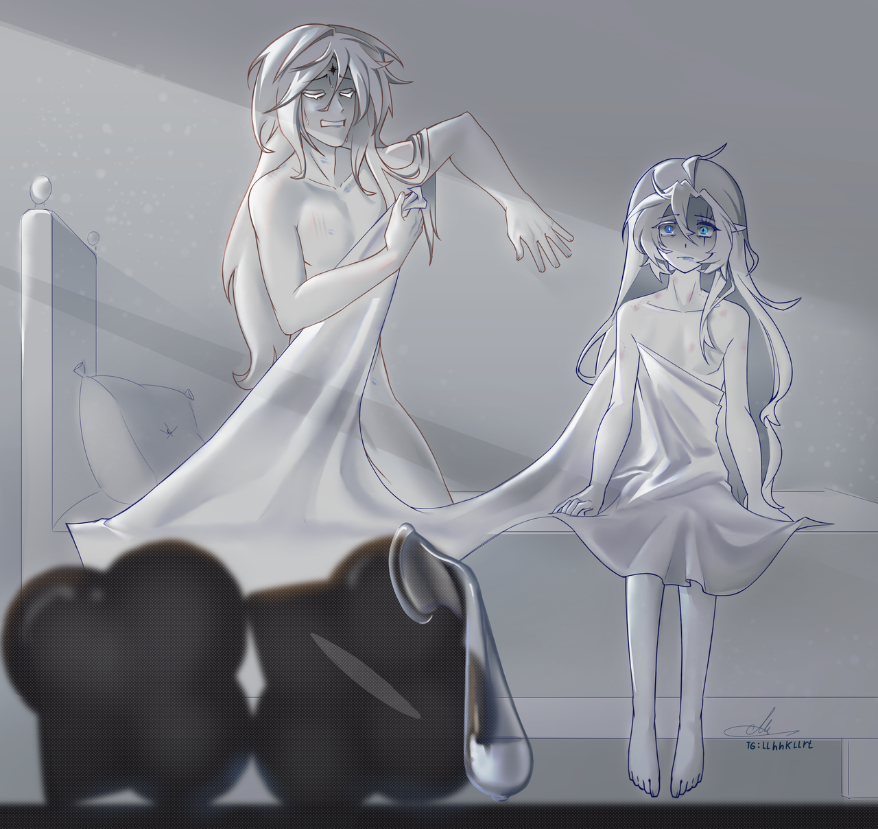 Pure Vanilla hurried to leave. Crawling to the edge of the bed on his knees, he tried to stand up sharply and bolt for the exit. But Shadow Milk didn't give up the blanket. Not an inch.