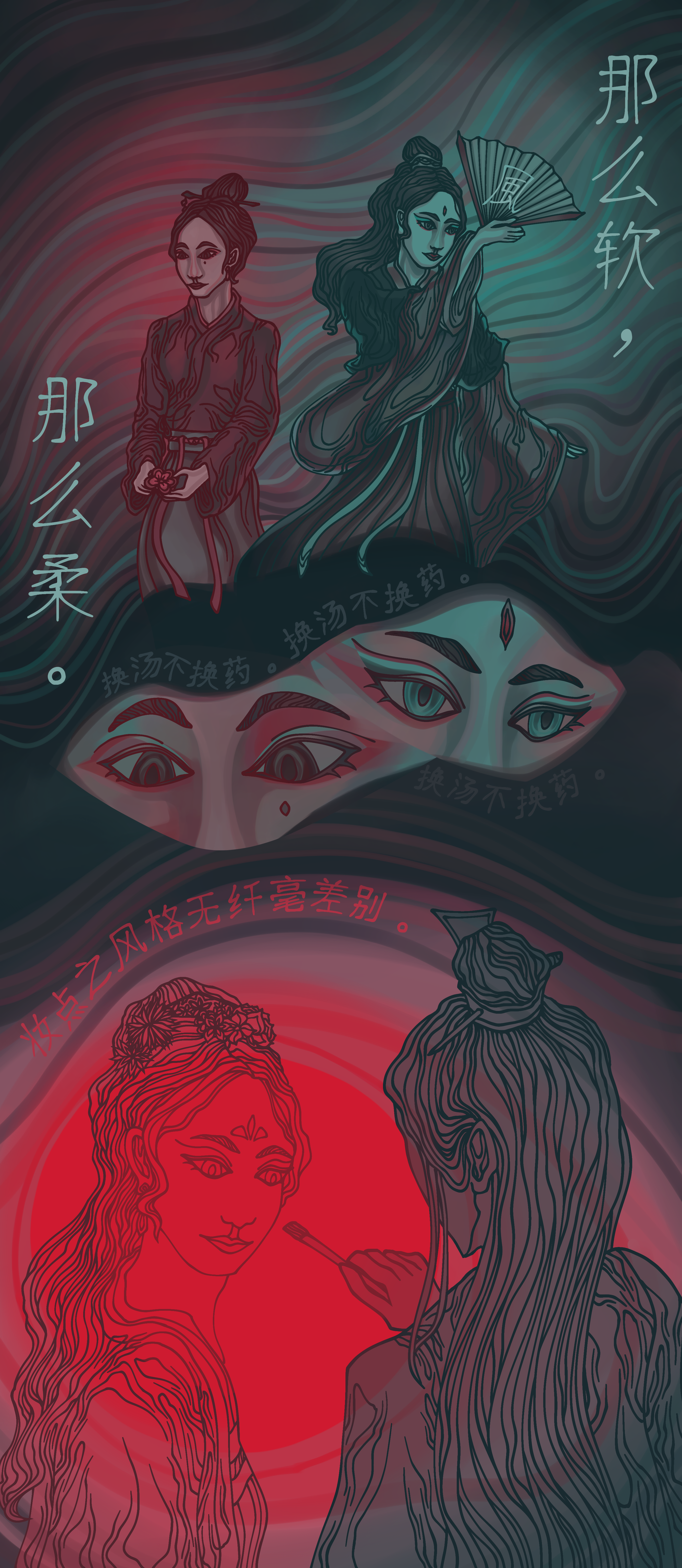 She makes an inquisitive noise—he’s staring. Damn it. He does not deign to reply to this; simply moves the brush, up and down, up and down, across Shi Qingxuan’s skin, wondering how it would feel to unhinge his jaw and swallow Shi Qingxuan whole, if she’d feel just as soft and pliant as she does under his hands now.